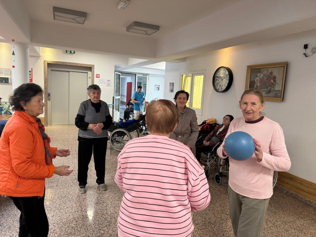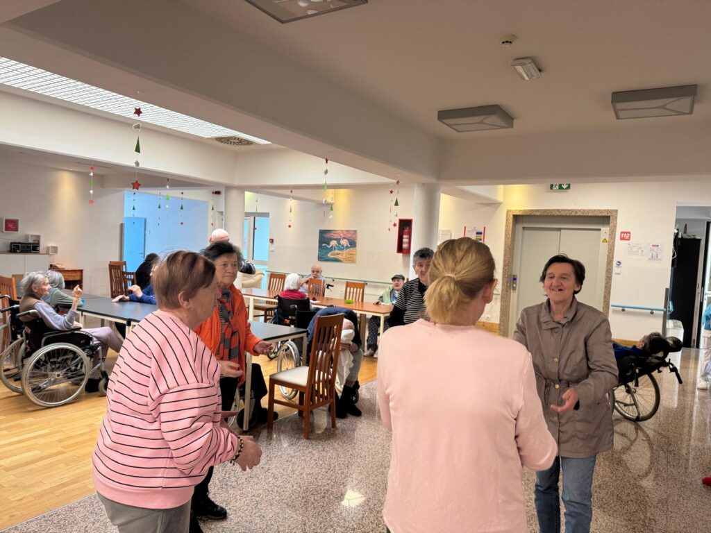 Treća aktivnost također se odvijala na odjelu demencije, gdje su korisnici proveli popodne s našim fizioterapeutima. Aktivnosti su uključivale igru s loptom i slaganje memory igara. Igra s loptom potiče pokretljivost, koordinaciju i suradnju među korisnicima, dok memory igre vježbaju pamćenje, pažnju i koncentraciju. Aktivnosti su bile prilagođene mogućnostima korisnika, a naglasak je bio na sudjelovanju i kontinuitetu, a ne na rezultatu.