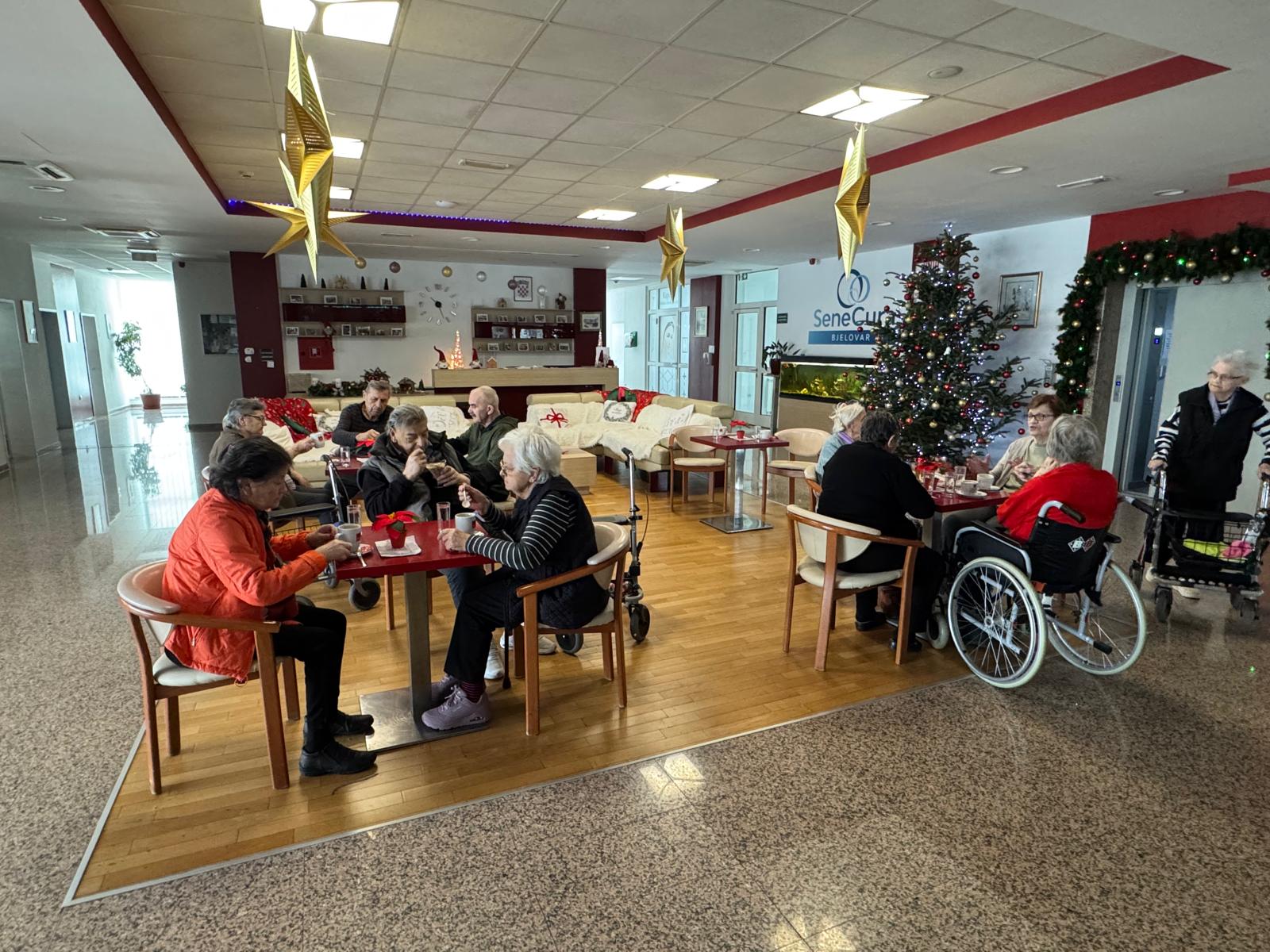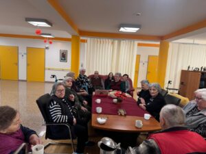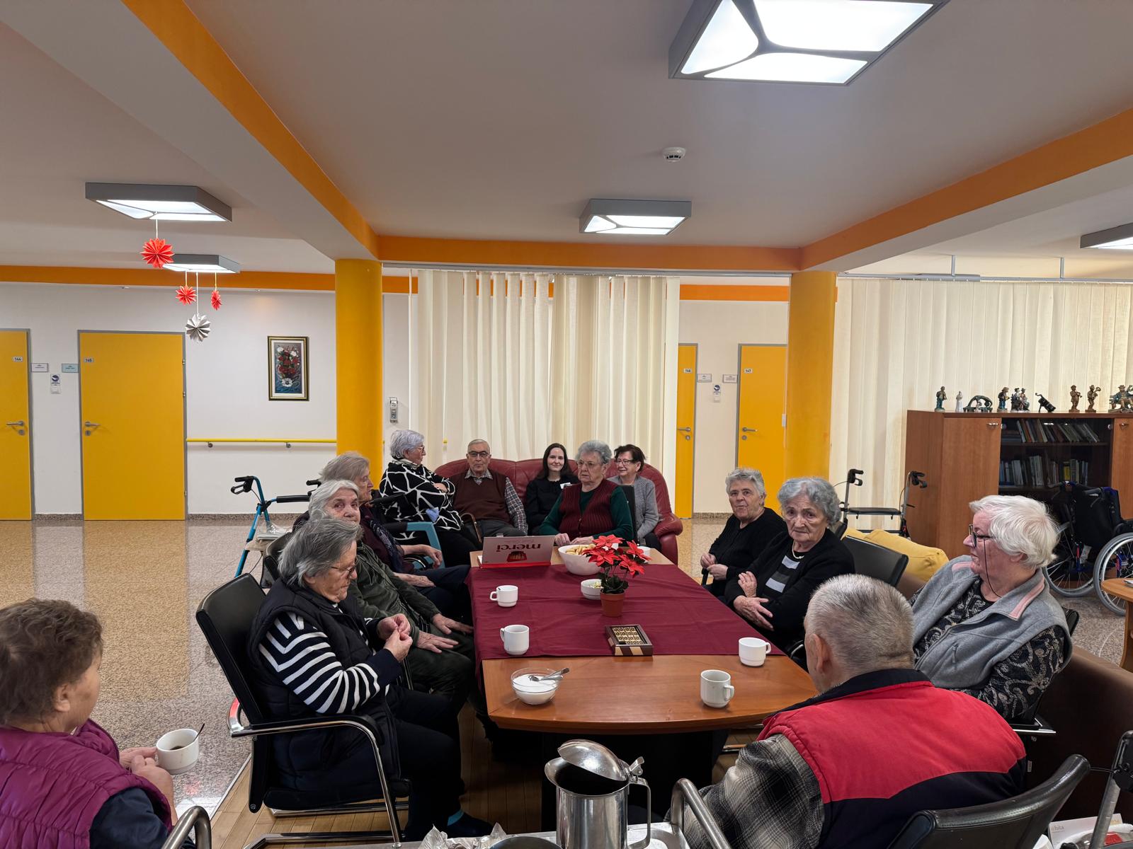 Druga aktivnost bila je namijenjena korisnicima s odjela demencije. Naša fizioterapeutkinja Lea povela je korisnike u prizemlje doma na kavicu u caffe bar. Promjena okruženja i izlazak iz svakodnevne rutine pozitivno su utjecali na raspoloženje korisnika. Zajednički trenuci bili su ispunjeni razgovorom i smijehom, a boravak u javnom prostoru pridonio je osjećaju normalnosti i uključenosti u svakodnevni život.