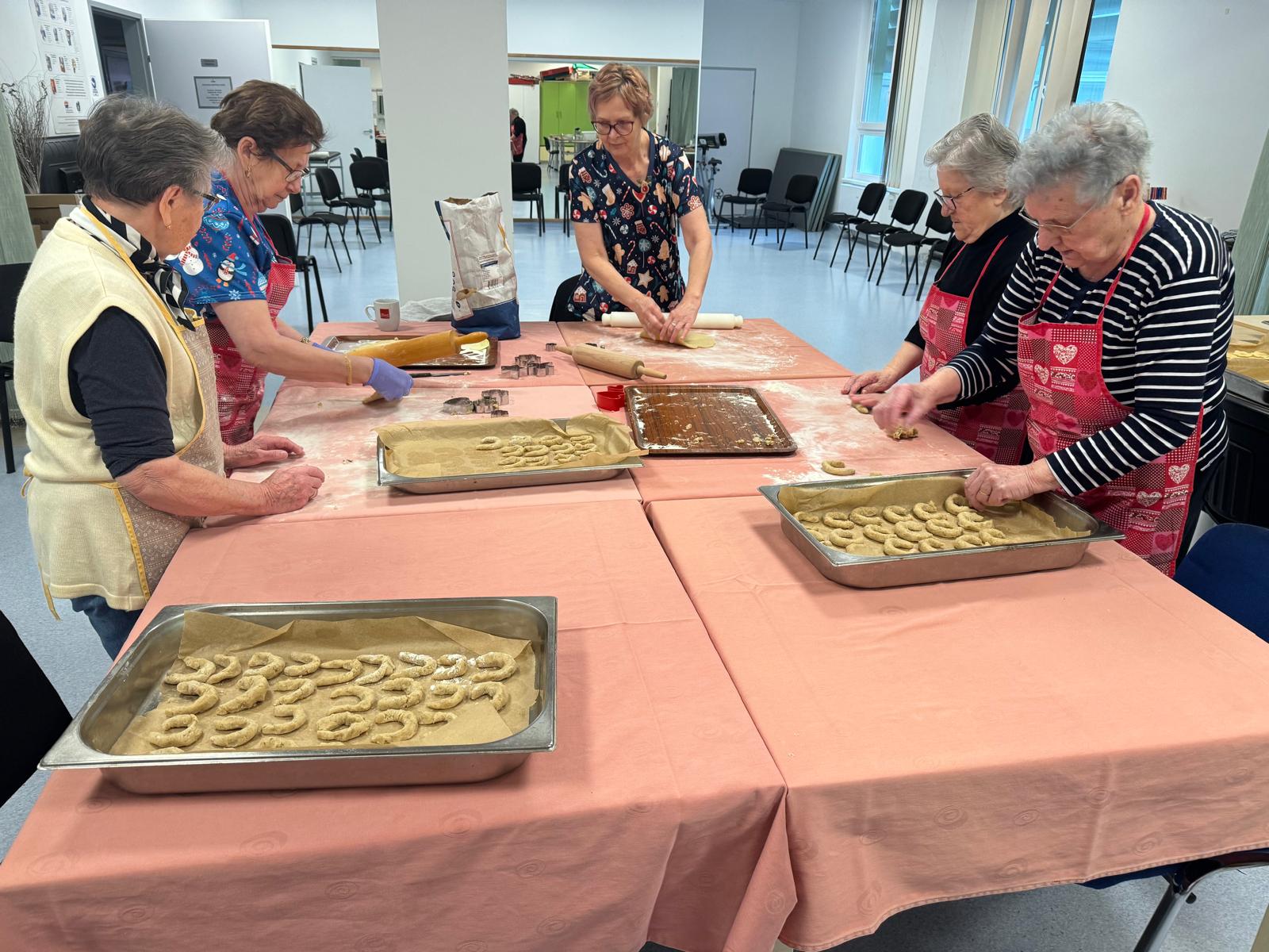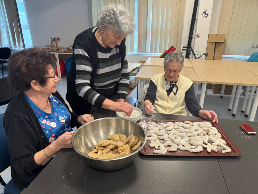Poseban dio blagdanskih priprema bila je izrada božićnih kolačića. Naše su korisnice, uz podršku animatorice Alene i fizioterapeutkinje Lee, pekle tradicionalne kolače koji su bili posluženi na Badnjak i Božić. Mirisi svježe pečenih kolača ispunili su dom i vratili mnoge uspomene na blagdane provedene u vlastitim domovima. Ova aktivnost potaknula je kreativnost, suradnju i osjećaj korisnosti.