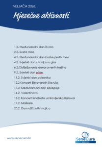 Mjesec započinje obilježavanjem Međunarodnog dana života (1. 2.), a Sveta misa (2. 2.) pružit će korisnicima duhovni sadržaj i priliku za zajedničko okupljanje. Međunarodni dan borbe protiv raka (4. 2.) obilježit će se s naglaskom na važnost podrške, informiranosti i solidarnosti, dok se istoga dana obilježava i Svjetski dan čitanja na glas, koji potiče slušanje, pažnju i komunikaciju.