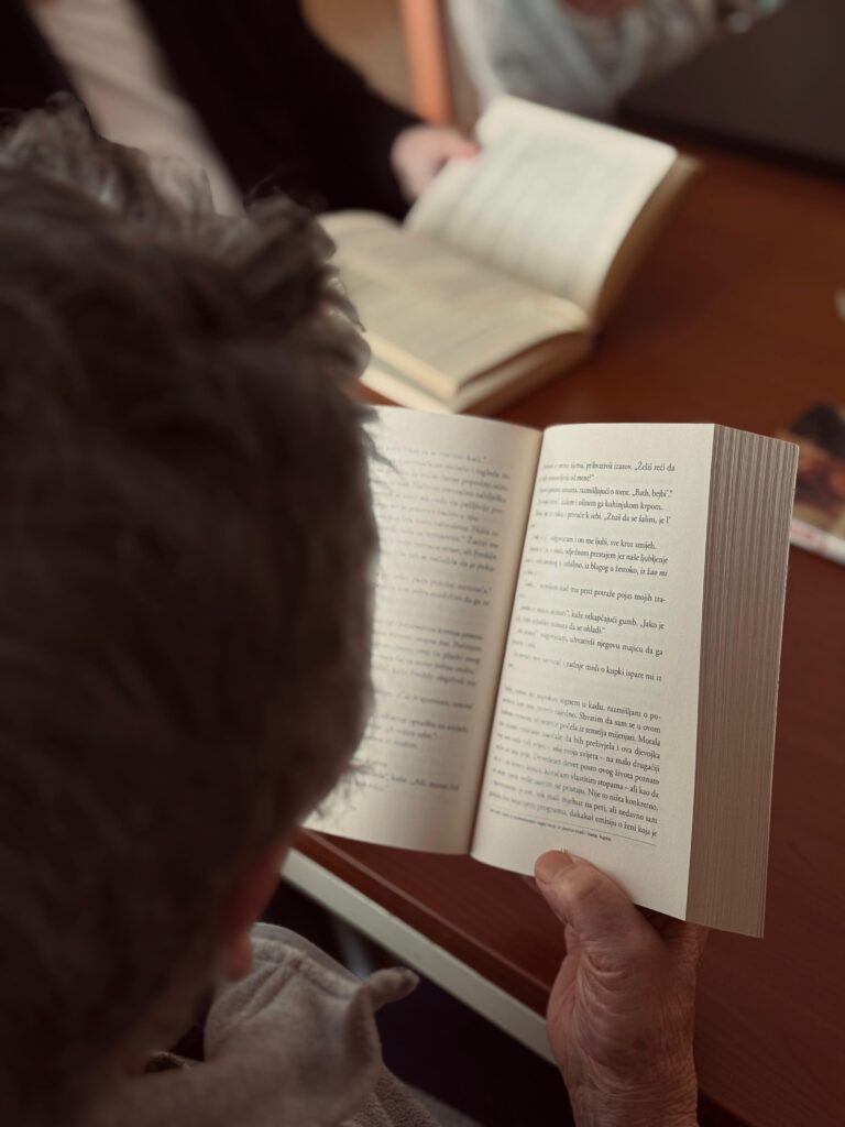 Čitanje je u domu uvijek lijepa prilika za druženje. Ono potiče razgovor i razmjenu iskustava. Također pomaže u održavanju mentalne aktivnosti. Za naše korisnike to je i način da provedu kvalitetno vrijeme zajedno.
