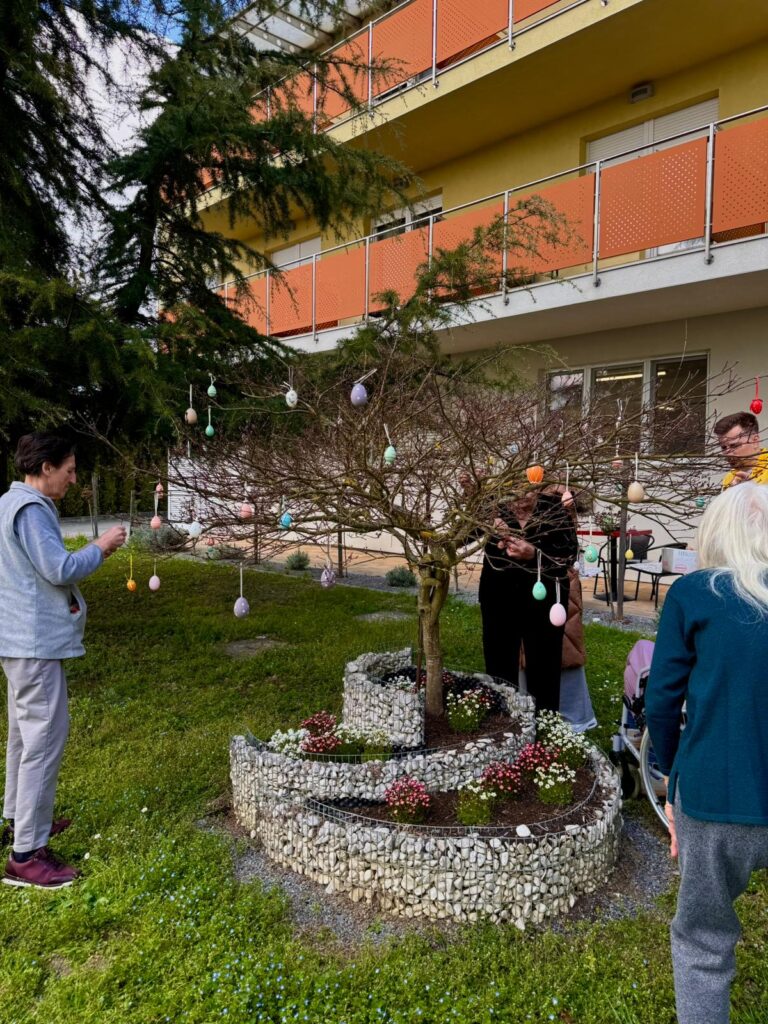 Uskršnje uređenje dvorišta u SeneCura Bjelovar još je jednom pokazalo koliko su zajedničke aktivnosti važne za kvalitetu života u domu. Kroz jednostavne, ali značajne trenutke, korisnici su imali priliku povezati se, razgovarati i zajedno stvarati.